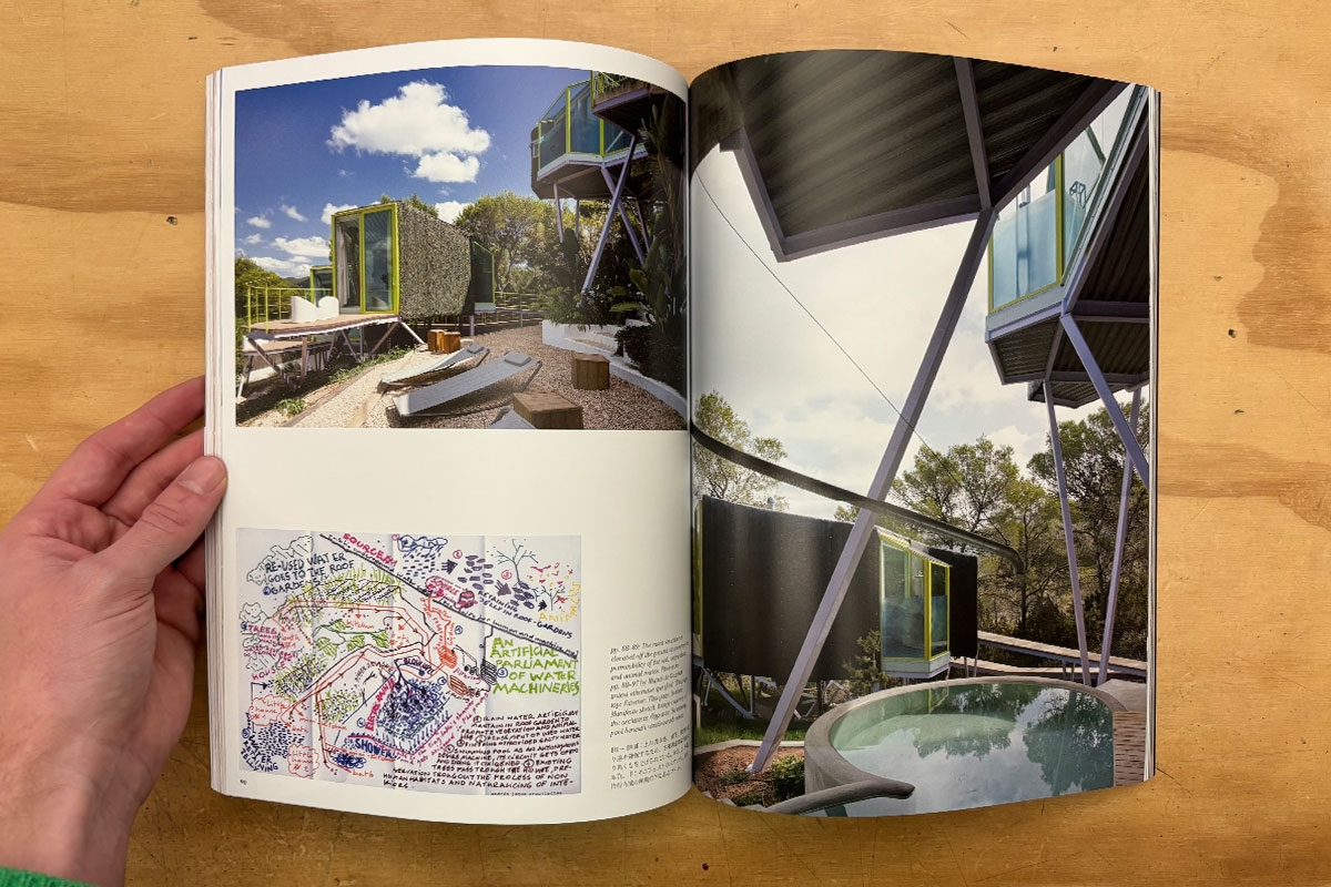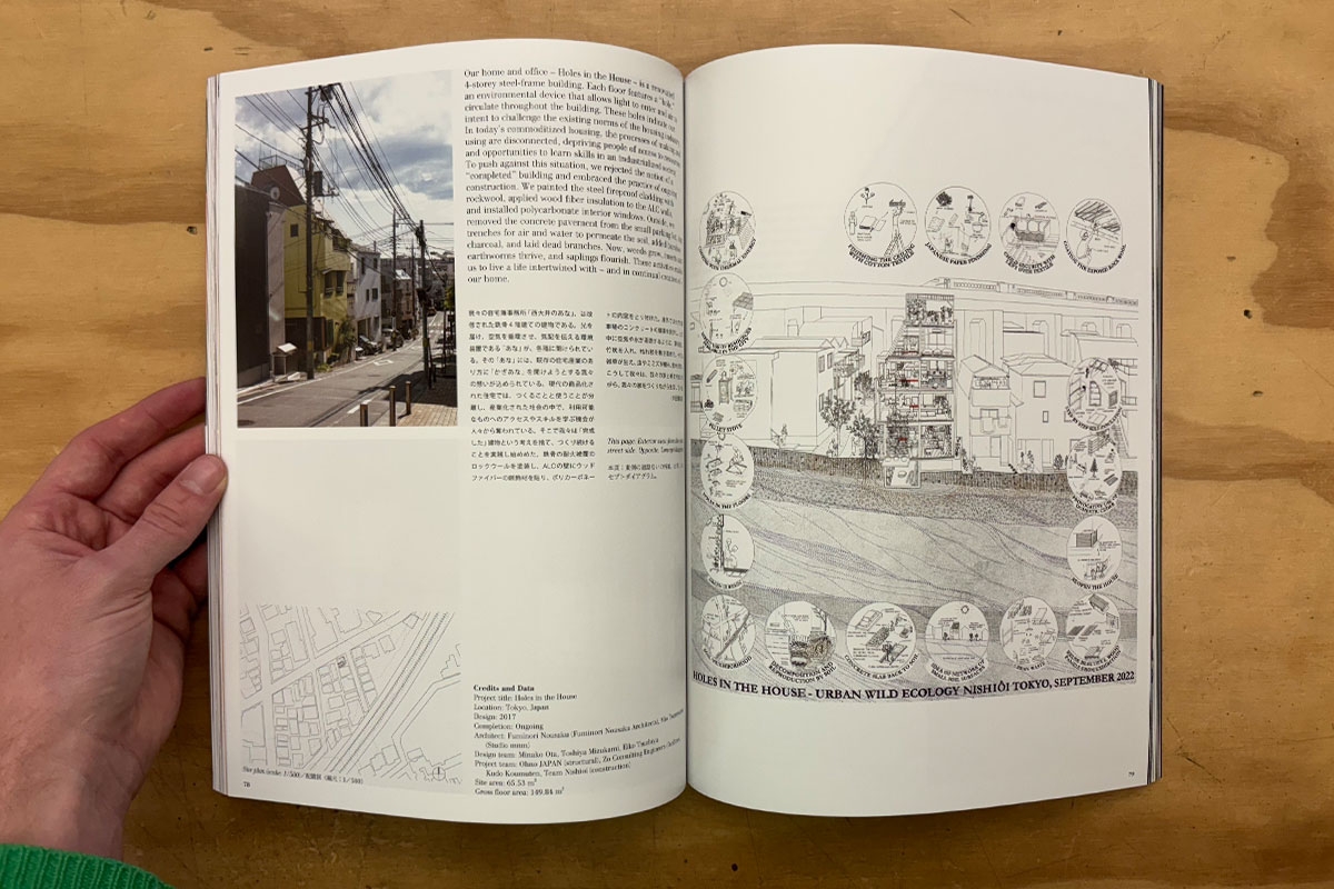 The volume presents the office’s investigation of the more-than-human dimension of the built environment through the concept of transspecies architecture, which counters unilateral anthropocentric thinking by imagining architecture as a gathering of heterogenous entities, with permeable layers and varying scales. The issue furthers this critical dialogue by bringing together architects from around the globe, including TAKK from Spain and Studio mnm and Fuminori Nousaku from Japan.
