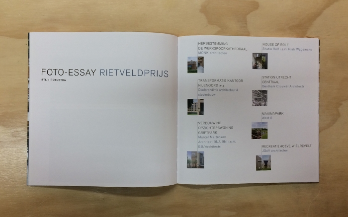 Bij de prijsuitreiking werd ook de tweejaarlijkse Rietveldprijspublicatie gepresenteerd, met daarin het volledige juryrapport, essays van Tim de Boer en Lara Voerman en een foto-essay van de geselecteerde projecten door Stijn Poelstra.