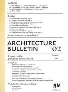 The second issue of the Architecture Bulletin is dedicated to former NAI director Aaron Betsky, who has left Rotterdam for the Cincinnati Art Museum in the USA. The authors of this 'Bulletin Amicorum' are people with whom Betsky has worked in recent years, and they address themes that Betsky holds dear and has placed in the foreground in the NAI's programming over the last five years. The subjects of the essays include the future of the polder landscape of the Netherlands and strategies for urban renewal, and there is also a response to the question of what makes Dutch design so good. The history of architecture is addressed in texts about the field's Eurocentricity and on the subject of the disregarded influence of American modernism on Dutch architecture.