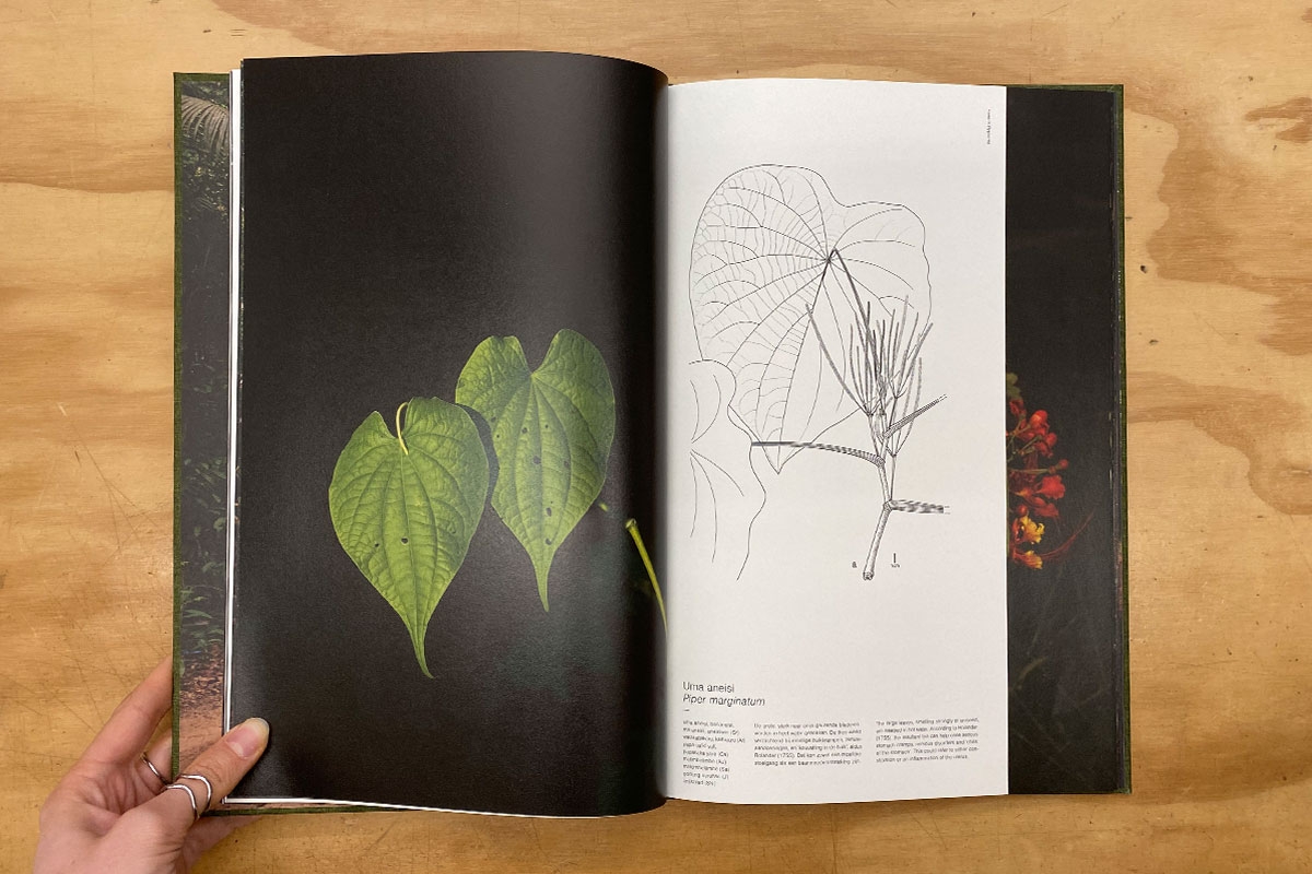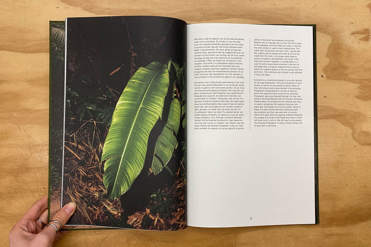 For this project, Piergoelam travelled to Suriname, her parents’ country of birth, for the first time in 2024. During her journey through the rainforest, she photographed plants first described in 1755 by the Swedish biologist Daniel Rolander. As a European observer, Rolander documented the use of plants in Suriname and recorded exchanges of knowledge between enslaved people and local communities. His accounts of resistance, from everyday acts to courageous escape attempts, and his observation that enslaved people knew the forest ‘like the back of their hand’ became an important source of inspiration for Piergoelam. Through collaboration with biologists from Naturalis and local partners in Suriname, including Irvin Ristie, who guided Piergoelam through the rainforest, and shaman Amashina Oedemmaloe, the project intricately connects art, shamanism, and science.
