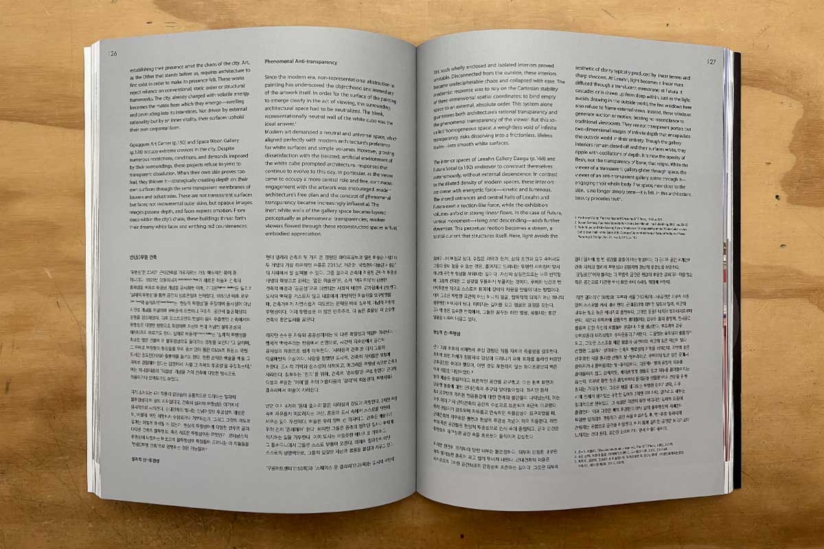 The Small Galeries chapter, Anti-Transparent Architecture, spotlights four small-scale exhibition spaces tucked within dense urban settings. These compact yet resonant spaces stand on their own amid extreme spatial constraints, offering an experience of “invisible architecture” that is tactile, layered, and sensorially rich precisely because it resists transparency. Projects include Space Woon Gallery and Gguggum Art Center.