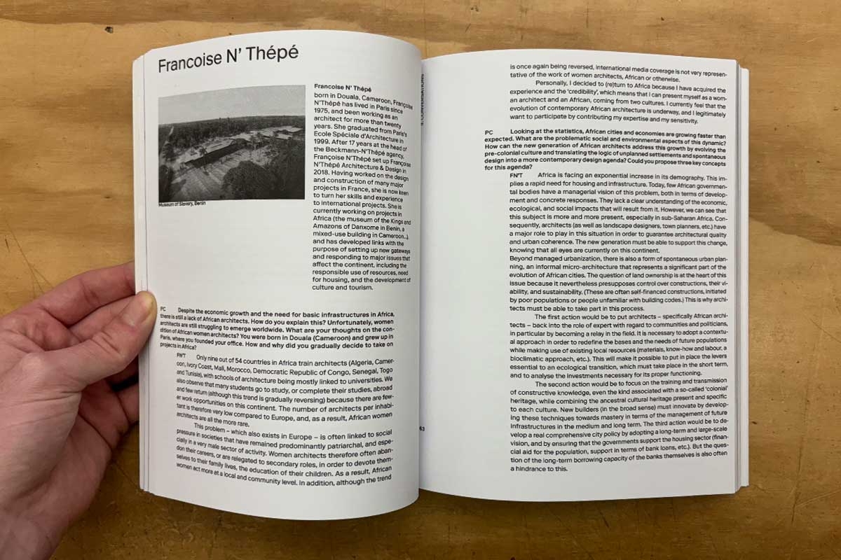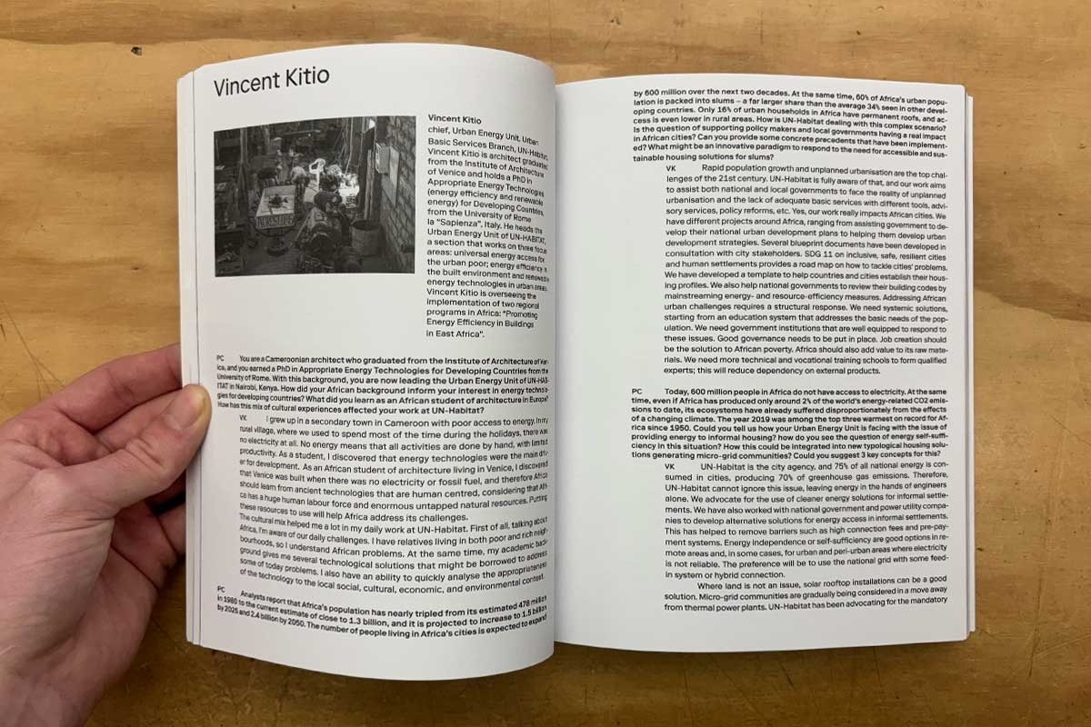 With Contributions by: Chirstian Benimana, MASS (Architect/Rwanda) – Cheick Diallo (Designer/Mali) – Ron Eglash (Professor of Information at University of Michigan /USA) – Ugo La Pietra (Designer/Italy) – Hanif Kara, AKT II (Professor in practice of technology at the Graduate School of Design Harvard/USA) – Vincent Kitio (UN–Habitat/Kenya) – Giancarlo Mazzanti, El Equipo Mazzanti (Architect/Colombia) – Ronald Rael, Rael San Fratello (Professor of Architecture at the University of California Berkeley/USA) – AbdouMaliq Simone (Senior Professional Fellow at the Urban Institute at University of Sheffield/UK) – Françoise N’Thépé (Architect/France–Cameroon).