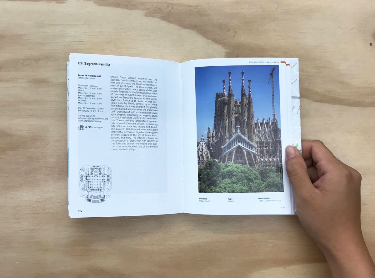 The book's jacket opens out into a map, marking the locations of the architectural works and interesting sites to visit. Each entry includes a photo of the whole building, architectural drawings, a short description, and facts including architect, year of construction, address, website, and how to visit