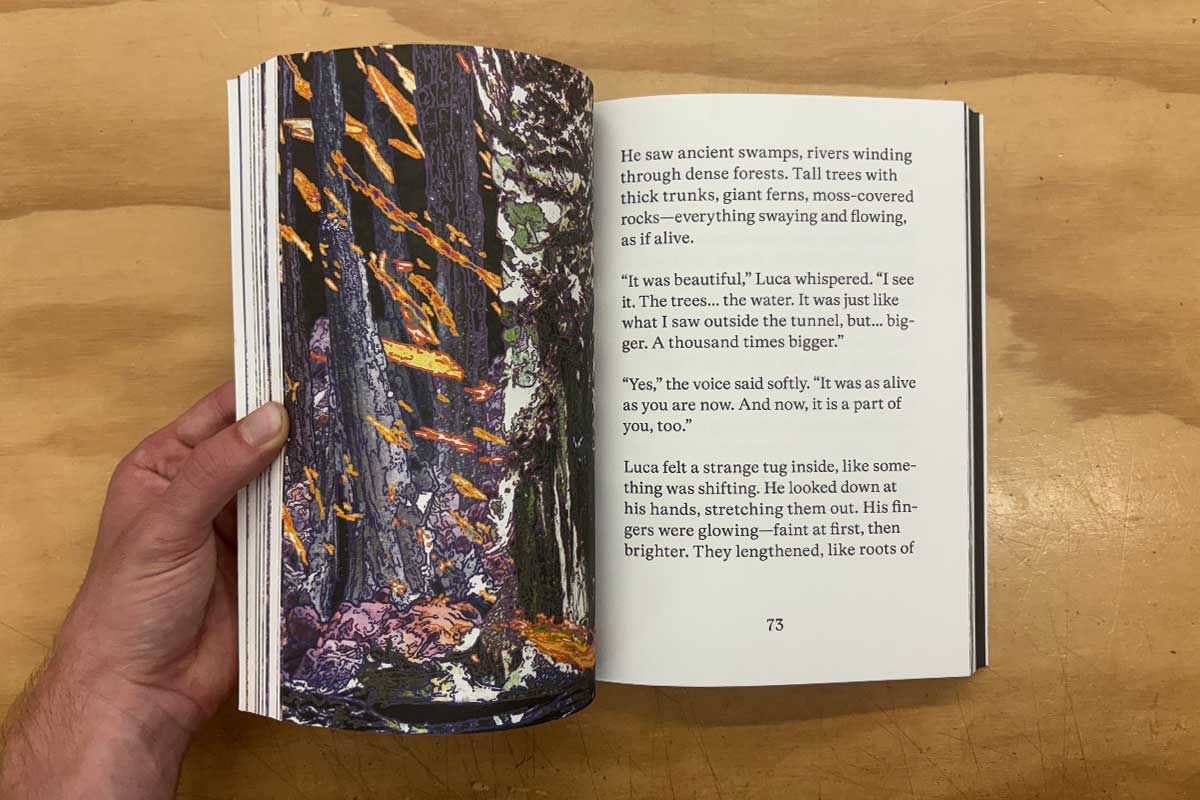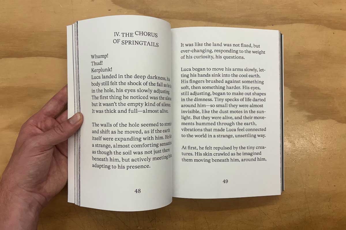 Structured in two parts, the book begins with a tale, illustrated by Clément Vuillier, about a child who, upon falling into a hole in an open field, embarks on a journey through the hidden layers of the Earth, encountering unexpected lifeforms that shift his worldview. The second part features contributions from scientists and educators who inspired the story, offering insights that challenge anthropocentric thinking: a critical essay by Teresa Castro and interviews made by Formafantasma to Natalie Beenaerts, Roland Dreesen, Dirk Maes, and François Rineau, alongside afterwords by Louise Osieka and Formafantasma.