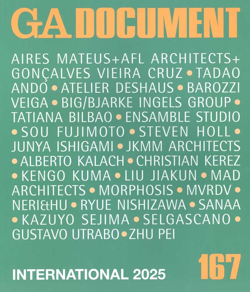This issue of GA Document features projects by Tadao Ando, Atelier Deshaus, Barozzi Veiga, BIG/Bjarke Ingels Group, Junya Ishigami, Christian Kerez, MAD Architects, Ryue Nishizawa, Kazuyo Sejima, selgascano, Zhu Pei, and others.