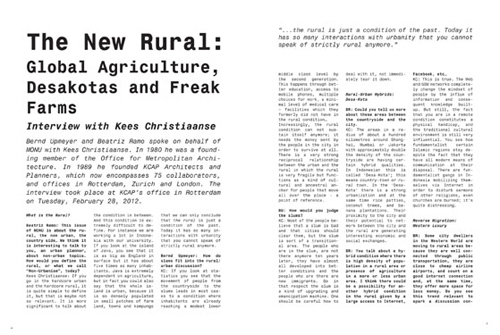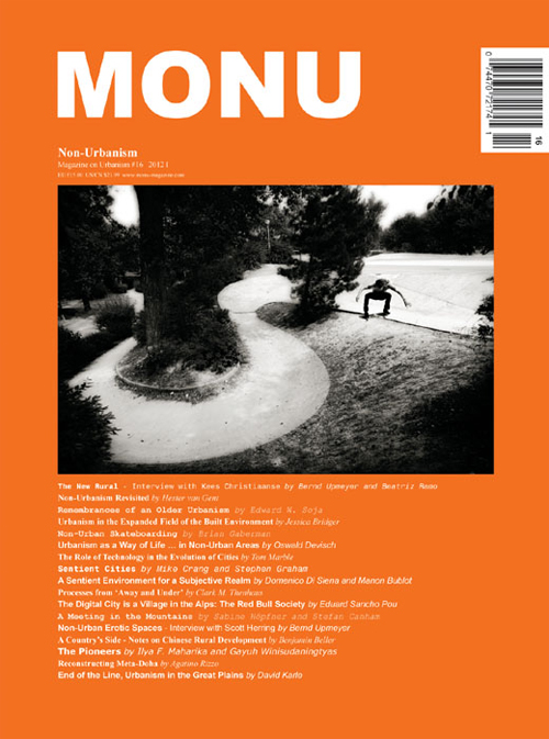 The New Rural: Global Agriculture, Desakotas and Freak Farms - Interview with Kees Christiaanse by Bernd Upmeyer and Beatriz Ramo Page; Non-Urbanism Revisited by Hester van Gent; Remembrances of an Older Urbanism by Edward W. Soja; Urbanism in the Expanded Field of the Built Environment by Jessica Bridger; Non-Urban Skateboarding by Brian Gaberman; Urbanism as a Way of Life … in Non-Urban Areas by Oswald Devisch; The Role of Technology in the Evolution of Cities by Tom Marble; Sentient Cities: Ambient Intelligence and the Politics of Urban Space by Mike Crang and Stephen Graham; A Sentient Environment for a Subjective Realm by Domenico Di Siena and Manon Bublot; Processes from 'Away and Under' by Clark M. Thenhaus; The Digital City is a Village in the Alps: The Red Bull Society by Eduard Sancho Pou; A Meeting in the Mountains by Sabine Höpfner and Stefan Canham; Non-Urban Erotic Spaces - Interview with Scott Herring by Bernd Upmeyer; A Country's Side - Notes on Chinese Rural Development by Benjamin Beller; The Pioneers: Mutation Agent of the Non-Urban by Ilya F. Maharika and Gayuh Winisudaningtyas; Reconstructing Meta-Doha by Agatino Rizzo; End of the Line, Urbanism in the Great Plains by David Karle