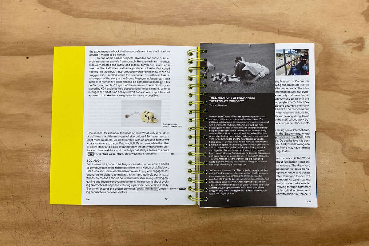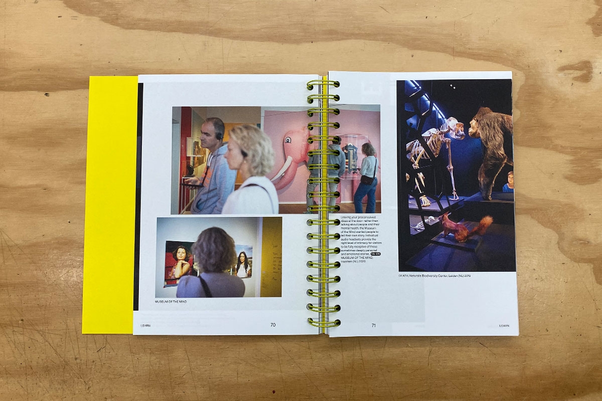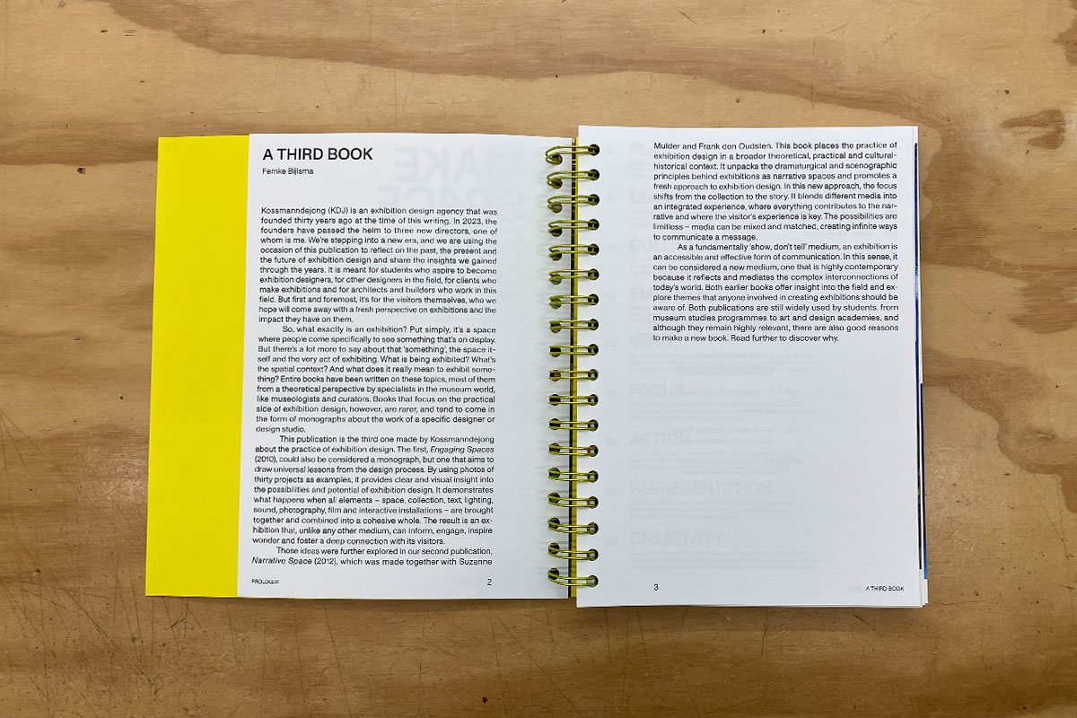 This publication is the third one made by KDJ about the practice of exhibition design. The first, Engaging Spaces (2010), uses project examples to illustrate the potential of exhibition design, emphasizing the cohesive combination of elements like space, collection, and media. The second, Narrative Space (2012), places exhibition design in a broader context, advocating for a story-focused approach where the visitor's experience is key.