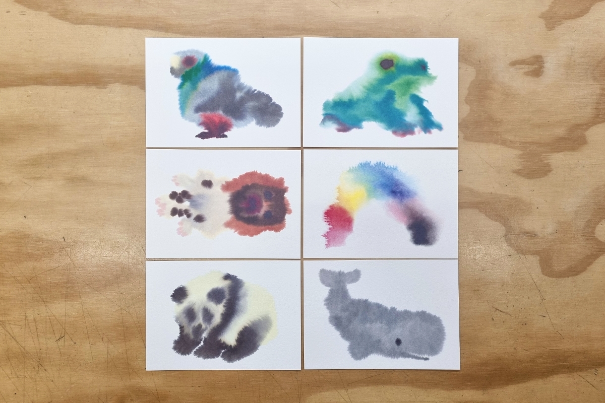 The ‘Bench Players’ postcard pack, for instance, includes a frog, parrot, panda bear, sperm whale, bumblebee, butterfly, jumping spider, and more.