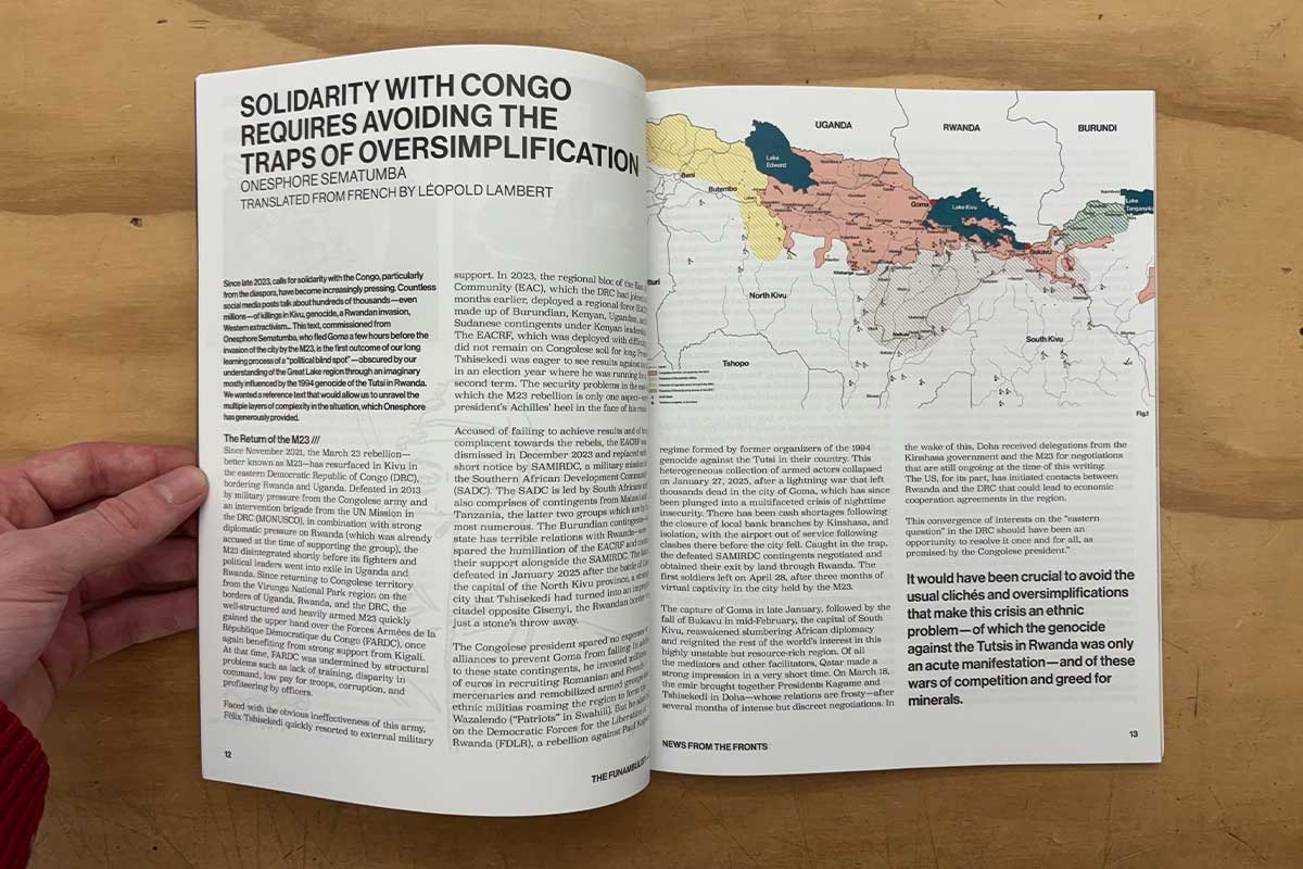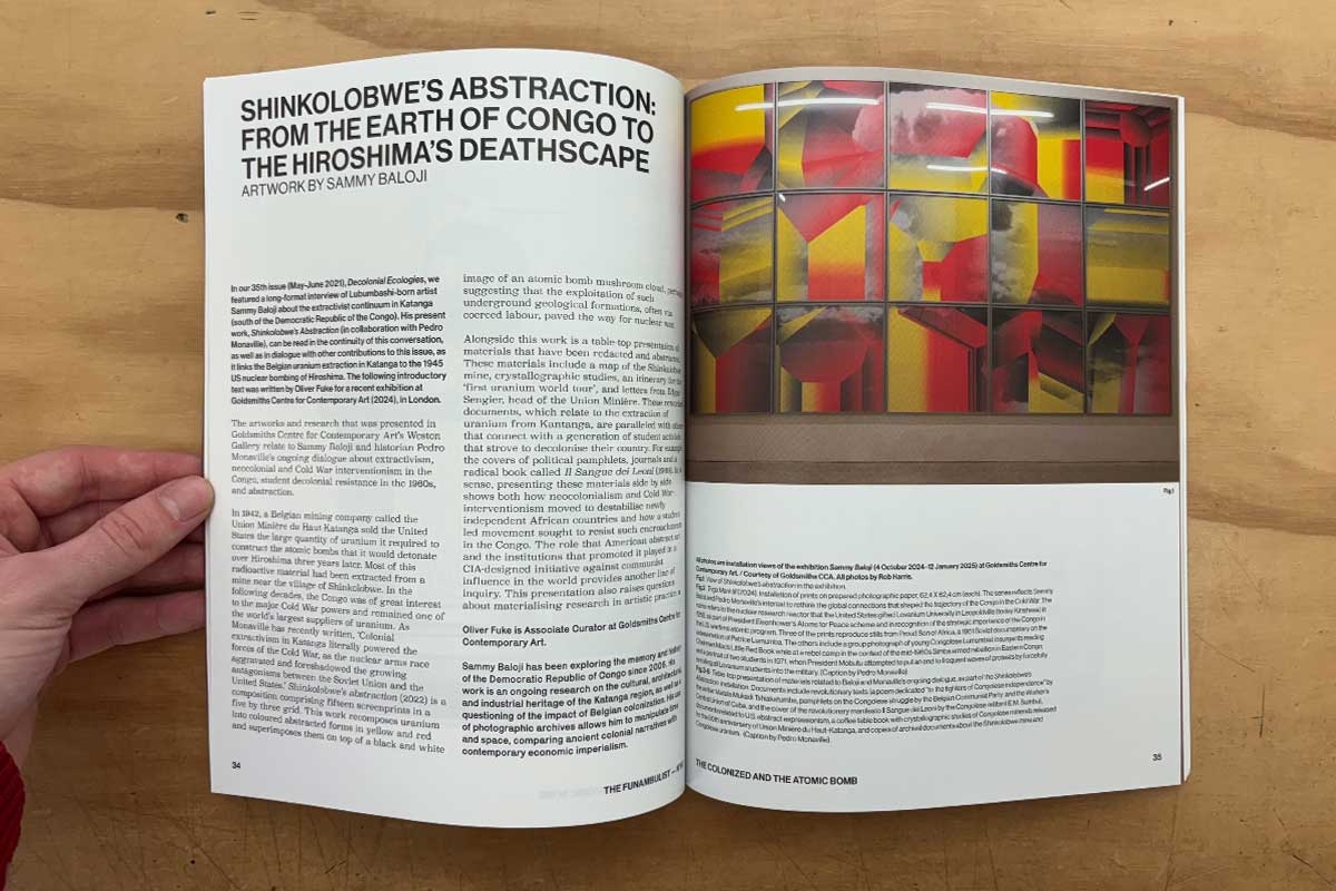 In two distinct contributions, Sammy Baloji and Roger Peet (the artist of the cover artwork) describe how the bomb’s uranium also came from Katanga in Belgian-colonized Congo. The issue includes a beautiful dialogue between Jennifer Marley and Sabu Kohso about the forms of resistance against colonial nuclearism by Tewa pueblos (whose land was stolen to build the Manhattan Project’s Los Alamos National Laboratory) and activists in Japan and Okinawa. It also features a fragment of Lou Cornum‘s Irradiated International manifesto insisting on this interconnectedness. In each of their respective contributions, Kia Quichocho and Jonathan K. Osorio mobilize Oceanian geographies of the US Empire (namely Guåhan, Tinian, and Hawaiʻi) for the role they were made to play in the 1945 nuclear bombings, as well as the subsequent so-called nuclear “testing” and the militarization of Chamoru and Kanaka Maoli’s archipelagos. This issue also insists on an understanding of Japan as a colonial power. Lisa Yoneyama centers the lives of colonized Koreans displaced to Honshu and Kyushu under duress and forced into labor, who were killed in the two nuclear bombings, while Christine Hong describes how the liberation of Korea from Japanese colonialism was prevented by US imperialism only days after the bombings.