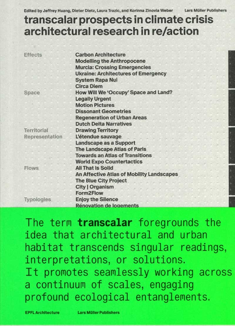 Architectural research is in re/action to this climate crisis. “Transcalar Prospects in Climate Crisis” offers a vital compilation of research projects and essays reflecting the investigative efforts at EPFL Architecture. Addressing critical issues like material uses, land and soil degradation, environmental justice and circular urban flows, the book brings together diverse, entangled perspectives and transcalar vantage points. It navigates complex factors such as comfort, standards, profit and individual needs, across a wide ecological spectrum. The book is a must-read for architects, urban planners, designers, scholars, and anyone seeking knowledge and inspiration for climate action, urging a conscious and critical, transcalar response to one of the most pressing issues of our time.