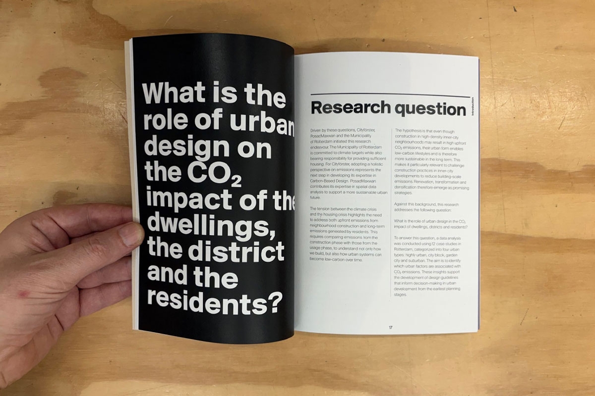 Cityförster, PosadMaxwan en Gemeente Rotterdam hebben de handen ineengeslagen in dit onderzoeksproject. Met de hoofdvraag "wat is de rol van stedenbouwkundig ontwerp op de CO₂ impact van Gebouw, Gebied en Gebruiker?" analyseert het onderzoek de footprint van 12 Rotterdamse buurten, en kijkt daarmee nadrukkelijk verder dan het gebouw: ook openbare ruimte, mobiliteit en de leefstijl van gebruikers worden meegenomen.