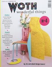 WOTH - Wonderful Things magazine is an international title coming from the Netherlands. You know our country from truly amazing designers like Scholten & Bajijngs, FormaFantasma, Studio Job, Piet Hein Eek, Raw Color, Studio Drift, Maarten Baas, and many more. WOTH hopes to offer you a wider and enticing vision of a design- interior- art- architecture- fashion- food- travel- magazine and all other thing that make life wonderful.